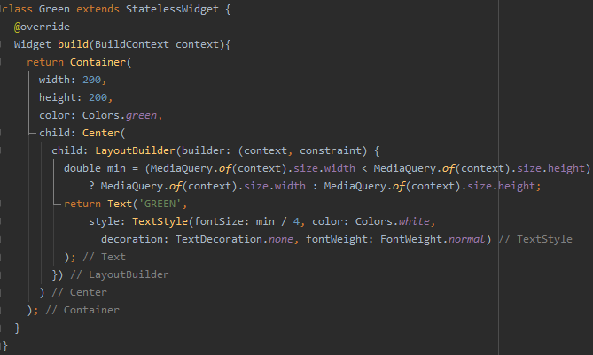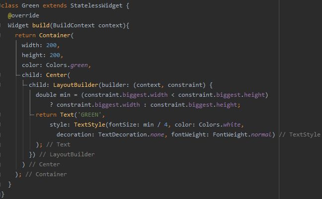 constraint의 경우 현재 Widget에 대한 Data가 할당된다. constraint는 LayoutBuilder(builder: (context, constraint)...) 에 할당된 것으로 Widget의 Size에 따라 하위 Widget들의 Size 조절이 필요할 때 유용하다. constraint.biggest 는 LayoutBuilder가 사용할 수 있는 최대 Size를 제공한다. 아래의 경우 LayoutBuilder 는 Container 하위의 Center 하위에 있기 때문에 Container의 size인 (200, 200) 을 제공한다. (오차가 있을 수 있지만 거의 비슷함)