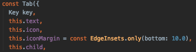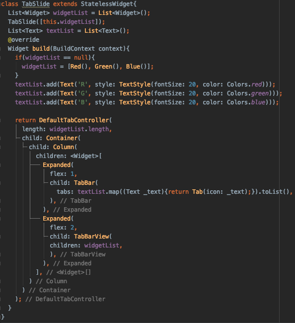 TabBar는 Click으로 Widget출력을 조절하는 공간이다. "tabs: " 요소에 WidgetList를 할당해야 하며 TabController객체, TabBarView 와 함께 쓰인다. (**TabBar의 "tabs: " 에 할당되는 Widget의 개수와 TabBarView의 "children: " 에 할당되는 Widget의 개수가 같아야 한다.) textList.map((Text _text){return Tab(icon: _text);}).toList() 는 textList에 있는 Text Widget을 _text를 통해 Tab Widget안에 할당하고 map으로 반환 한 후 List형식으로 다시 변환하는 것을 의미한다. (**textList를 바로 할당해도 가능한데 이렇게 번거롭게 한 이유는 Text형식으로 바로 반환 할 경우 fontSize만큼의 최소크기로 할당되어 여백이 없기 때문이다. Tab Widget은 기본적으로 할당된 iconMargin 이 있어 적절한 여백과 함께 출력된다.) return Tab(icon: _text) 에서 Tab의 "icon: " 요소는 Widget이다. Tab Widget에는 "text: " 요소가 따로 있지만 이 경우 String을 할당해야 하므로 Text Widget을 할당하기 위해서는 "icon: " 요소에 할당한다.
