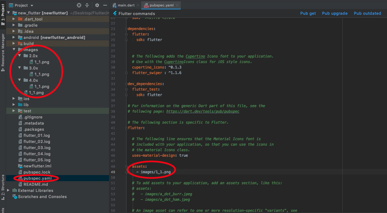 3. pubspec.yaml file에서 flutter: 아래에 "assets: -(1)/[image이름]" 을 추가한다.