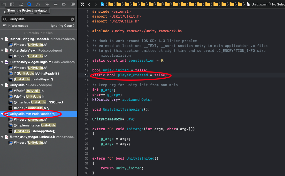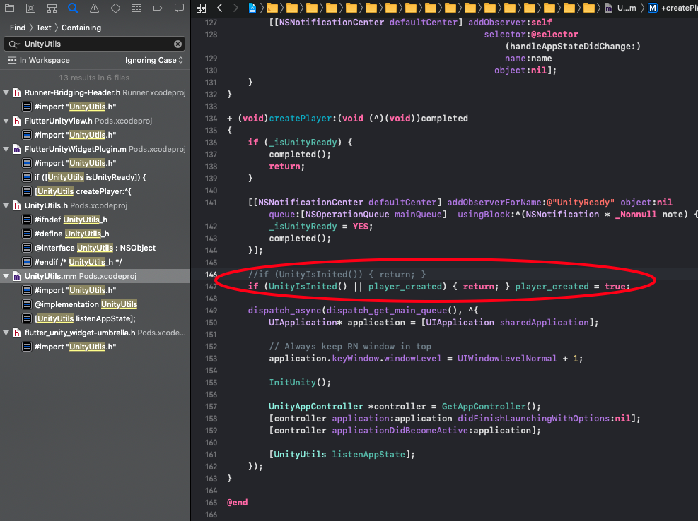 - Runner.xcworkspace를 열고 UnityUtils 검색, 12번째 줄에 코드추가