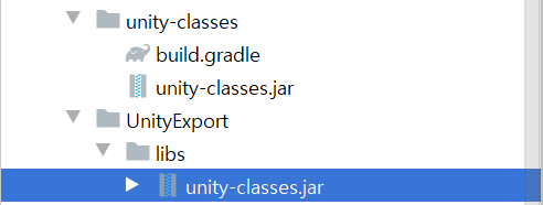 export를 무사히 마쳤다면 UnityExport/libs 폴더에 다음과 같이 .jar 과 .aar 파일이 생성된다. 이때 .jar 파일은 라이브러리 추가한뒤 위의 설정처럼 unity-classes 폴더에 overwrite 해주면된다. 또한 위의 설정처럼 UnityExport/setting.gradle 파일을 수정해 주어야 한다.