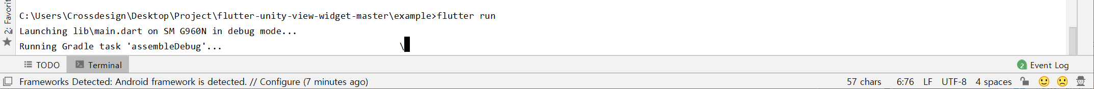 이제 빌드하여 실행시켜보자. 안드로이드 터미널에서 flutter run 하여 실행시킬 수 있다.