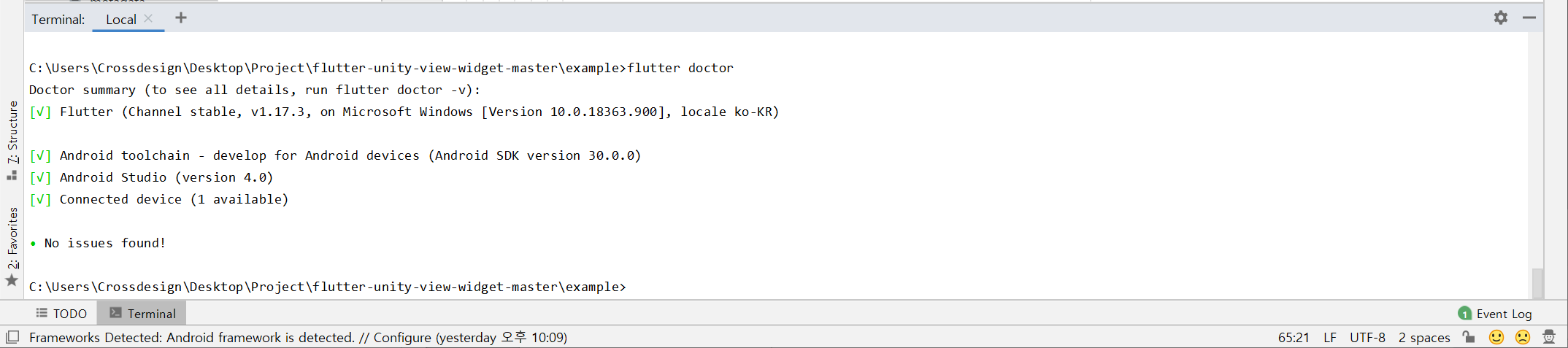 시작하기 전에 플러터 개발 환경 구성이 잘 되어있는지 검사 해보도록 하자. 안드로이드 스튜디오 터미널에서 다음 명령어를 사용하여 환경 구성이 조성되었는지 확인해보자.