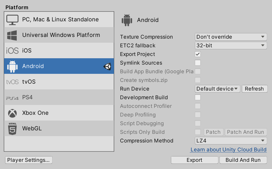 Unity 2019.3 이상의 버전은 Export Android (Unity 2019.3.*)을 이용해 Export 해준다.