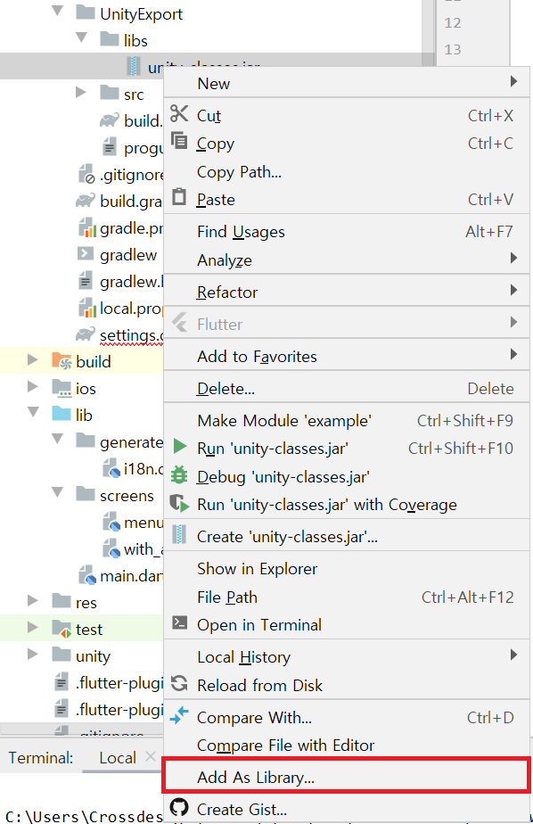 Unity에서 Export가 완료되면 example 파일에 UnityExport 폴더가 새로 생성되고 UnityExport/libs에 .jar 파일이 생성된다. 이 .jar 파일을 라이브러리로 추가한뒤 unity-classes 폴더에 넣어준다. 예제파일에서는 이미 unity-classes 폴더에 같은 이름의 .jar 파일이 있으므로 overwrite 할것인지 물어보는 알림이 뜬다 이때 승인해주면 된다.