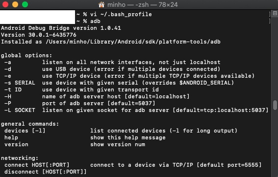 adb 를 입력하면 환경변수가 잘 변경 되었는지 확인할 수 있다.